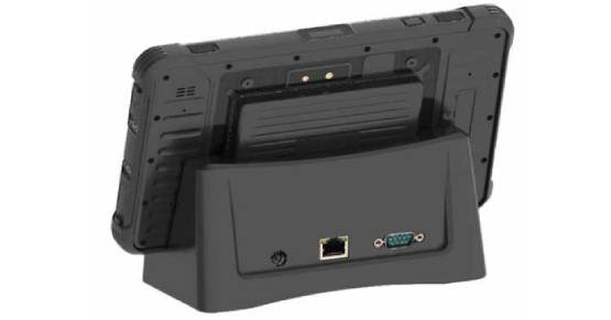 Desk Dock – A drop-in dock for hassle-free charging of your Rugged Tablet. With DC-input for charging plus port replication for 2x USB, 1x RJ45 LAN and 1x RS232 serial port.
